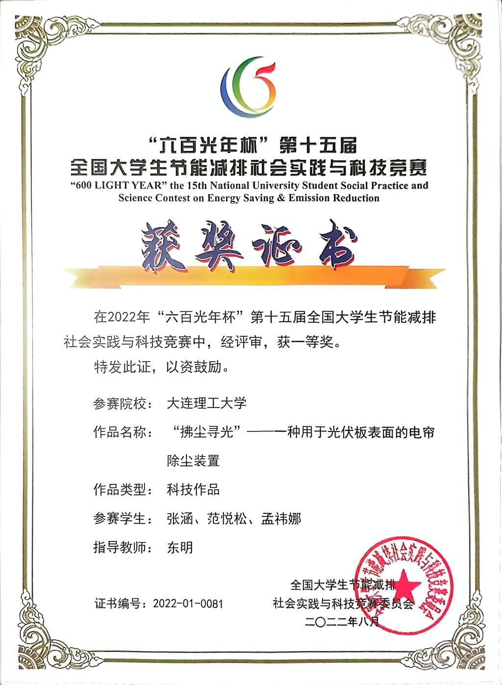 由东明教授指导完成的“‘拂尘寻光’一种用于光伏板表面的电帘除尘装置”荣获节能减排社会实践与科技竞赛一等奖。