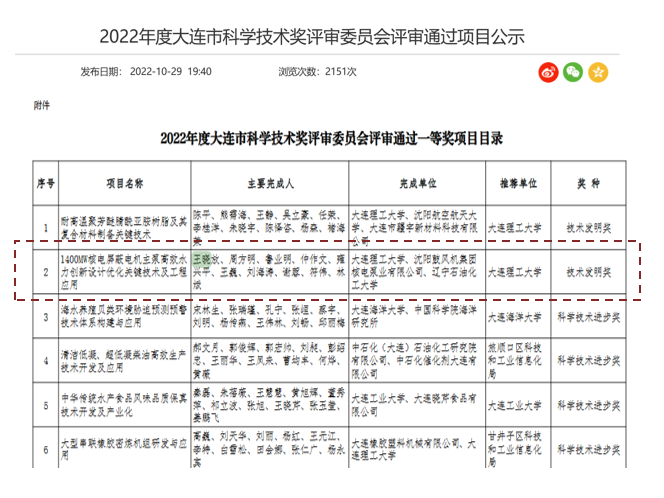 王晓放教授主持完成的“1400MW核电屏蔽电机主泵高效水力创新设计优化关键技术及工程应用”获大连市技术发明一等奖。