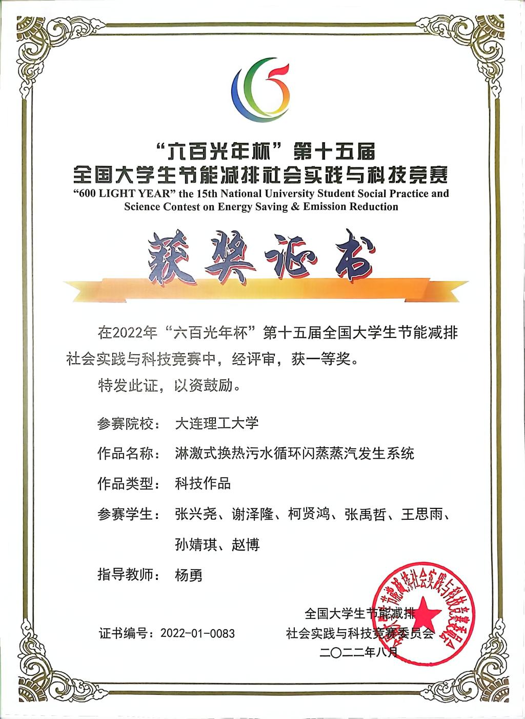 由杨勇副教授指导完成的“淋激式换热污水循环闪蒸蒸汽发生系统”荣获节能减排社会实践与科技竞赛一等奖。