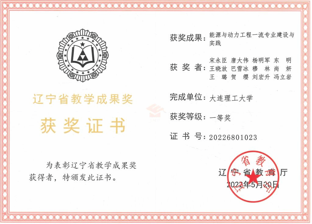 宋永臣教授主持完成的“能源与动力工程一流专业建设与实践”,获辽宁省教学成果奖一等奖。