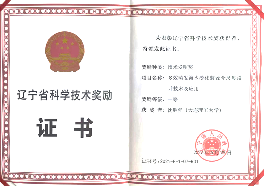 沈胜强教授主持完成的“多效蒸发海水淡化装置介尺度设计技术及应用”获辽宁省技术发明一等奖。
