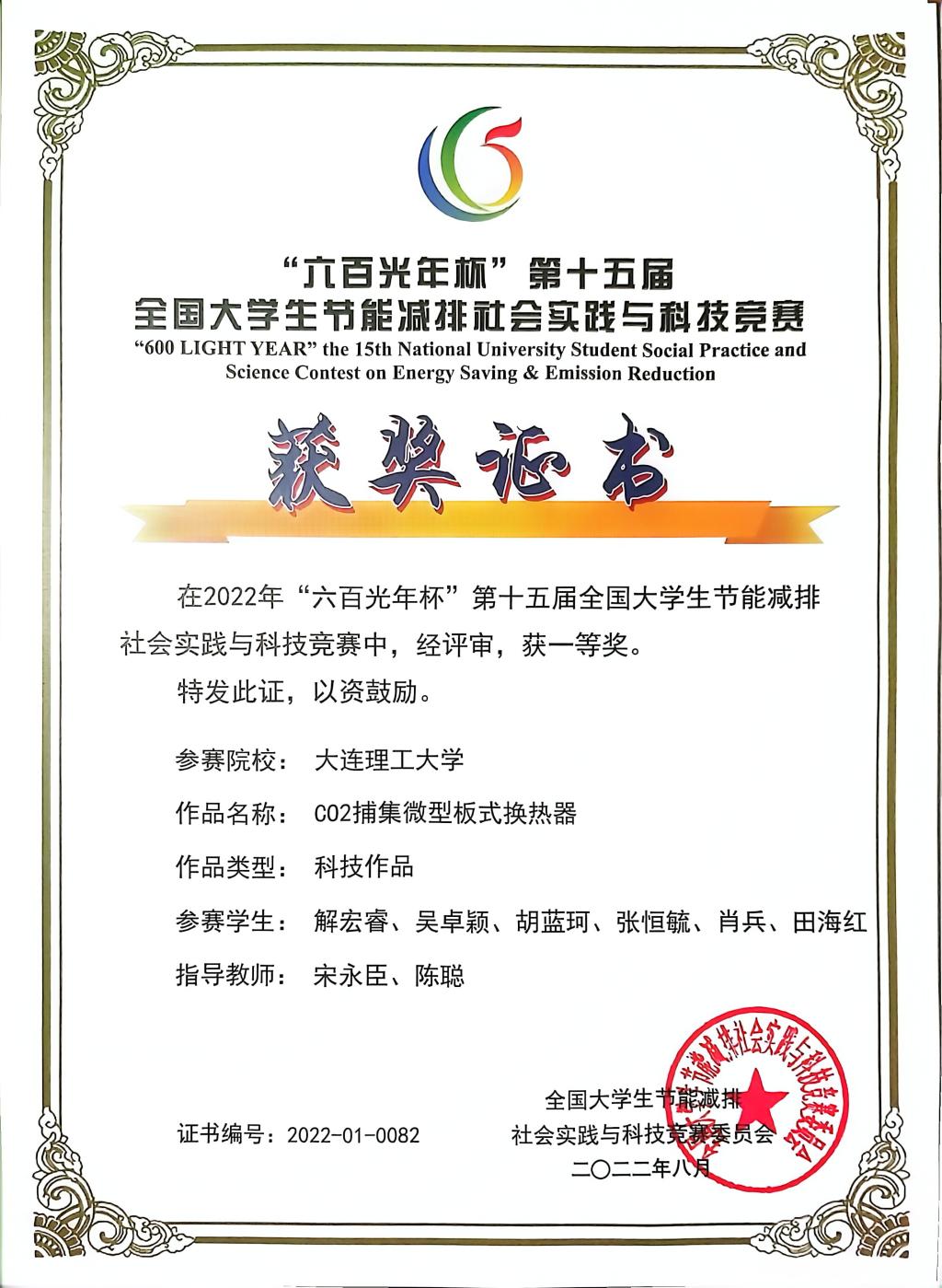 由宋永臣教授和陈聪教授指导完成的“CO 捕集微型板式换热器”荣获节能减排社会实践与科技竞赛一等奖。