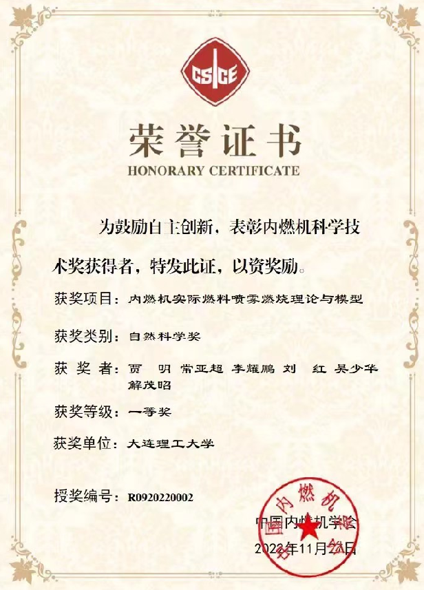 贾明教授主持完成的“内燃机实际燃料喷雾燃烧理论与模型”获中国内燃机学会自然科学奖一等奖。