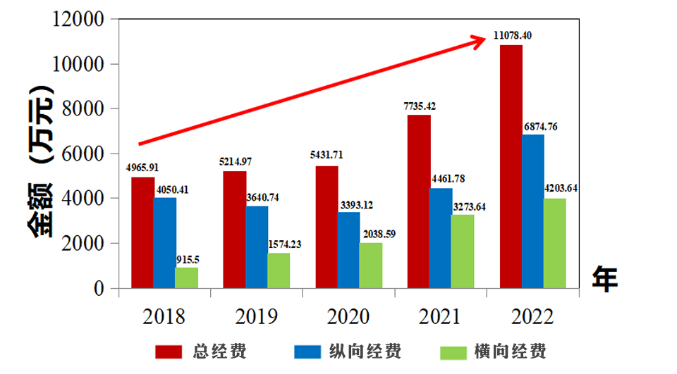 总经费连续五年趋于平稳上升态势,2022年横、纵向经费均达到历史新高,横向增长率 22.7%、纵向增长率 53.3%。人均科研进款108万元,服务国民经济主战场能力持续提升。