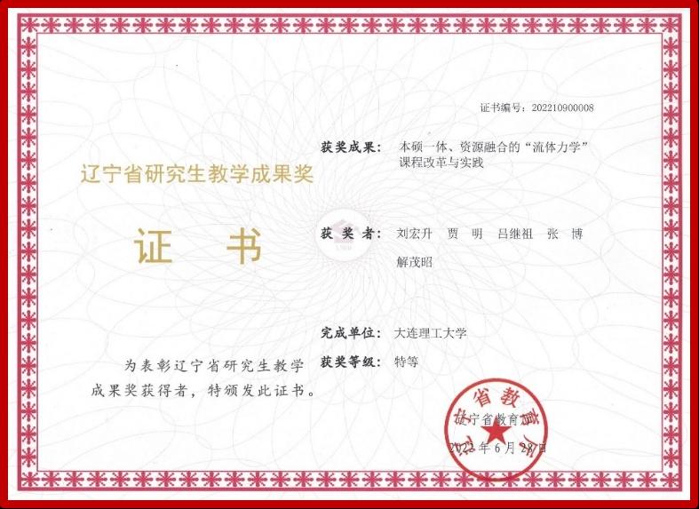 刘宏升教授主持完成的“本硕一体、资源融合的‘流体力学’课程改革与实践”获辽宁省研究生教学成果奖特等奖。