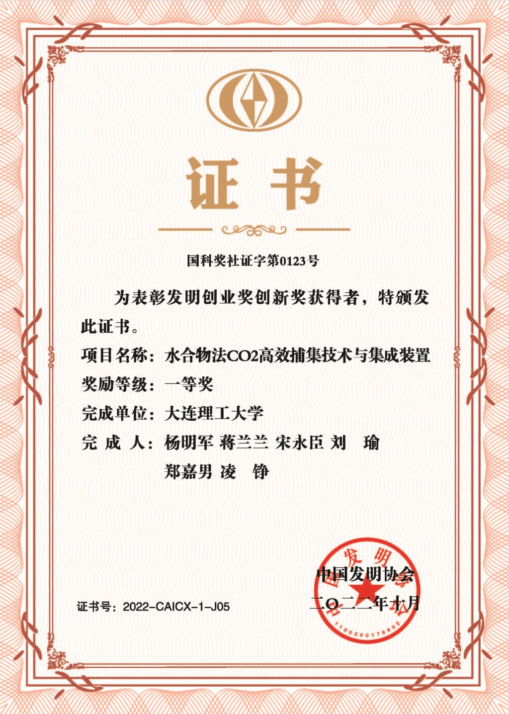 杨明军教授主持完成的“水合物法CO2高效捕集技术与集成装置”获中国发明协会一等奖。