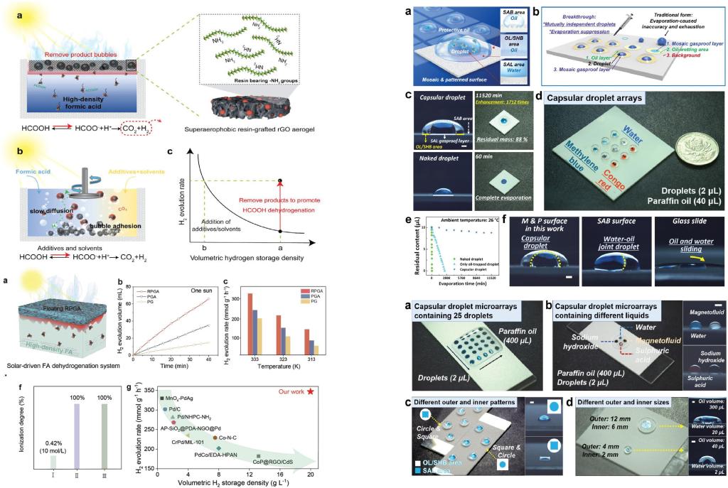 李林副教授、蒋博副教授等人提出了一种超疏气界面光热催化策略,通过加速产物移除驱动液氢载体的脱氢过程,解决了助剂/溶剂添加引起的储氢密度下降的问题。构建了一种具有多级孔结构的树脂接枝rGO气凝胶,得益于其超疏气表面特性和结构导向的气液界面设计,产物气泡得以快速从活性位点脱离。该气凝胶在19.8 g L-1的超高储氢密度液氢载体中获得了高达347 mmol g-1 h-1的释氢速率。与当前最先进的材料和储氢体系相比,其析氢速率提高了2倍,储氢密度提升了10倍。该策略不仅解决了高储氢密度液氢载体释氢速率低的问题,同时将太阳能界面蒸发技术拓展至涉及多相催化的能源、环境等领域。该成果以“Superaerophobic Resin-grafted rGO Aerogel with Boosted Product Removal Delivering High-Performance Hydrogen Release at Ultrahigh Storage Density”为题发表在《Small》期刊上。张倩博士生为第一作者,蒋博副教授为共同通讯作者,李林副教授为最后通讯作者。