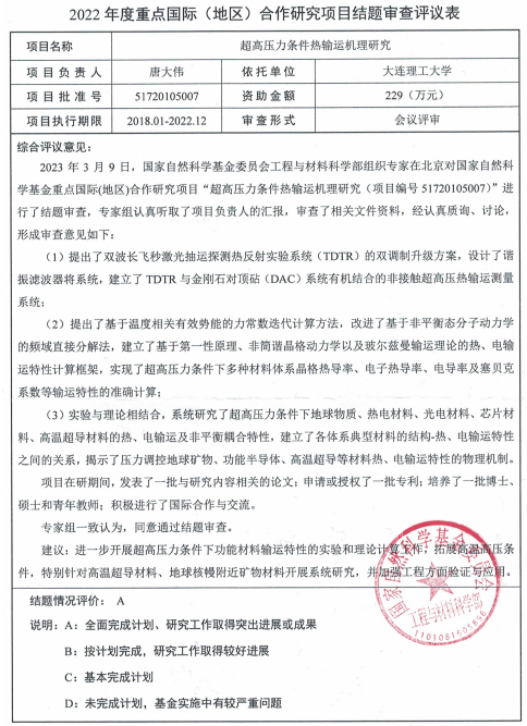 唐大伟教授作为项目负责人的国家自然科学基金重点国际(地区)合作项目“超高压力条件热输运机理研究”(51720105007)进行了结题审查,验收会议在北京召开。与会专家认真听取了课题组的汇报,审查了相关资料,经过详细讨论后,认为该项目计划全面完成,并且研究工作取得突出进展及成果,对该项目给与A的评审成绩。
