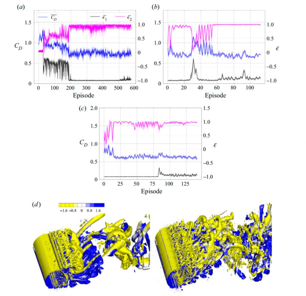 图1(a)、(b)和(c)分别显示了Re=104时从零开始训练,Re=104和Re=1.4x105时的迁移学习,过程的阻力系数和控制圆柱旋转速度;图1(d)显示了Re=1.4x105条件下,未控制的湍流泄涡和强化学习控制后的湍流泄涡。