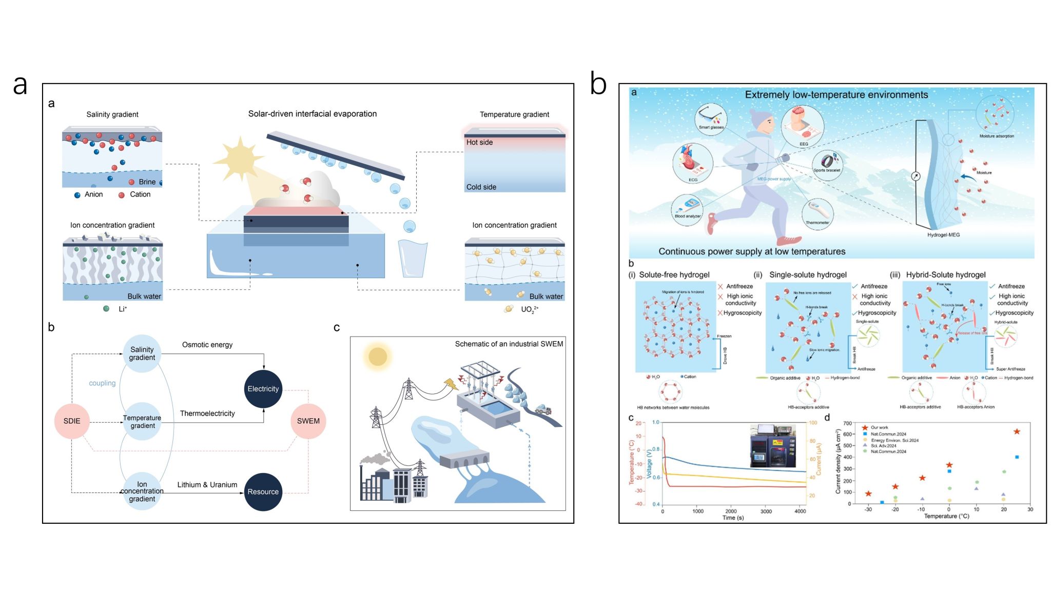 针对界面蒸发系统在多物理场耦合与能质传递方面所面临的问题,研究团队提出通过调控能量和物质传递过程,强化界面蒸发系统中的多种梯度(如温度梯度、盐度梯度和离子浓度梯度),以提升水-能源-矿物的联合生产效率。这一策略旨在优化太阳能海水淡化、热电输出、海水提锂等过程的综合输出效能。此外,团队还探讨了如何协同不同梯度、并有效缓解梯度之间的冲突,所提出的“梯度工程”策略有望为界面蒸发技术的发展开辟新的研究思路与方向。与此同时,为解决极端环境下的湿气发电失效问题,研究团队提出了一种基于氢键网络调控的混合溶质协同策略,从分子层面重构水的氢键网络,实现了抗冻性与高效电力输出的平衡。通过引入具有功能互补性的阴离子盐和有机溶剂,有效抑制了低温下水分的冻结,稳定了离子迁移通道。基于该策略设计的湿气发电器在-30℃下能够稳定输出0.67 V的电压和86.2 μA·cm⁻²的电流密度,低温电学性能较现有技术提升了一个数量级。此外,长期测试表明,该器件在-25℃和50%相对湿度条件下可连续工作超过10天,输出电压稳定维持在0.74 V,验证了其在极端条件下的可靠性。这一系列技术突破不仅为界面蒸发和湿气发电技术的发展和应用提供了可行的解决方案,也为可持续能源的开发与极端环境下的能源保障提供了理论基础与技术支撑。