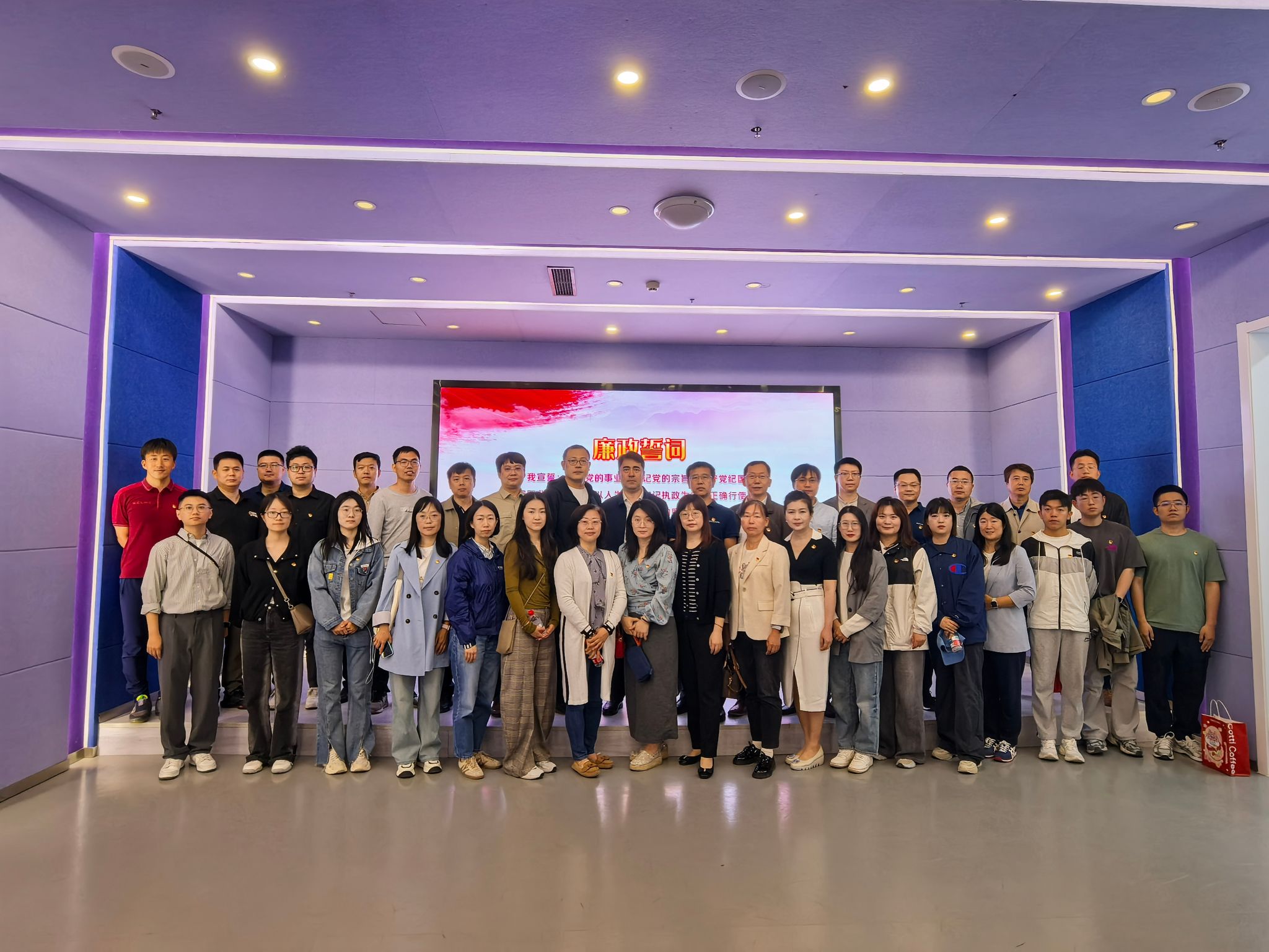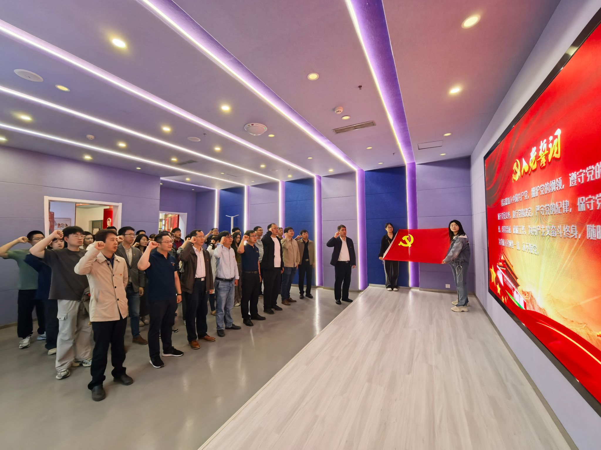 在廉洁人生体验馆内,党员干部们跟随讲解员的步伐,依次参观了各个主题展区。通过丰富的图文资料、生动的多媒体展示以及逼真的场景模拟,深入了解了党的反腐倡廉历程、廉洁文化的深厚内涵以及违纪违法典型案例,引导着党员干部们深刻思考廉洁从政、廉洁用权、廉洁修身、廉洁齐家的重要意义。随后,在党旗下,重温入党誓词。