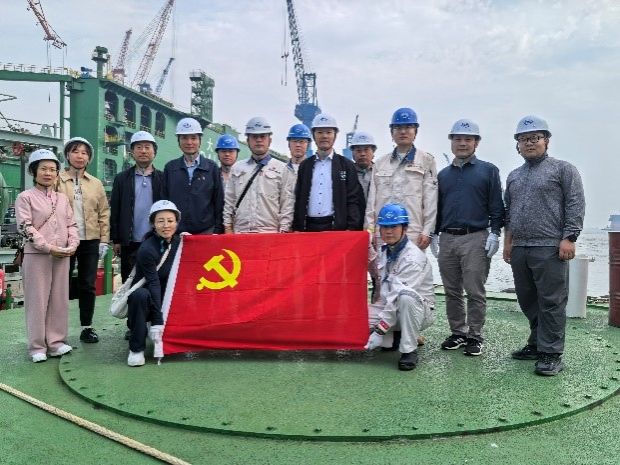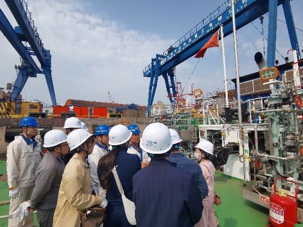 在中远轮机车间党支部参会党员的带领下,内燃机教工党支部成员参观了中远集团刚刚交付使用的氨燃料动力拖轮,并就氨燃料发动机及氨燃料船舶的相关专业问题进行现场交流。