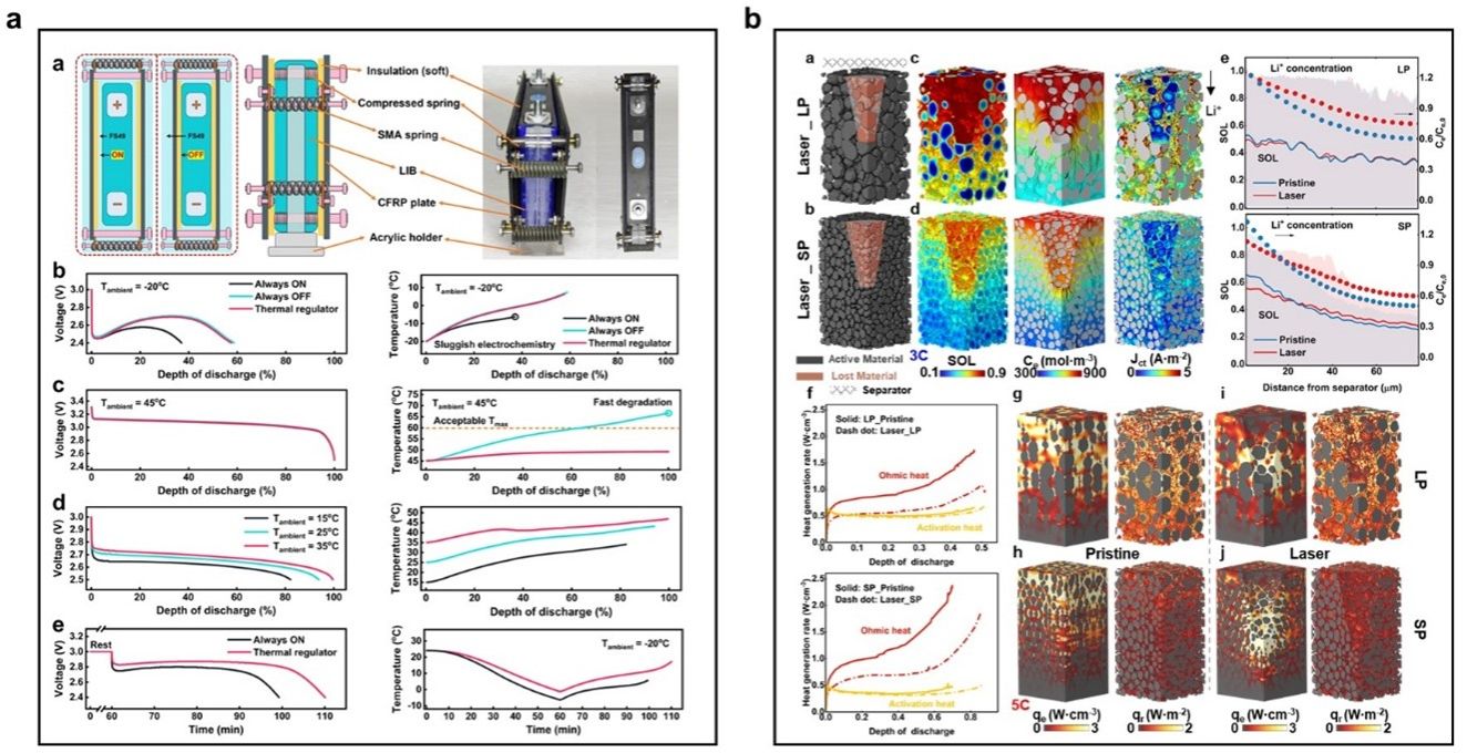 图(a)宏观尺度上锂离子电池的非线性热调节;(b)微观尺度上的锂离子电池电化学-热-质耦合模拟