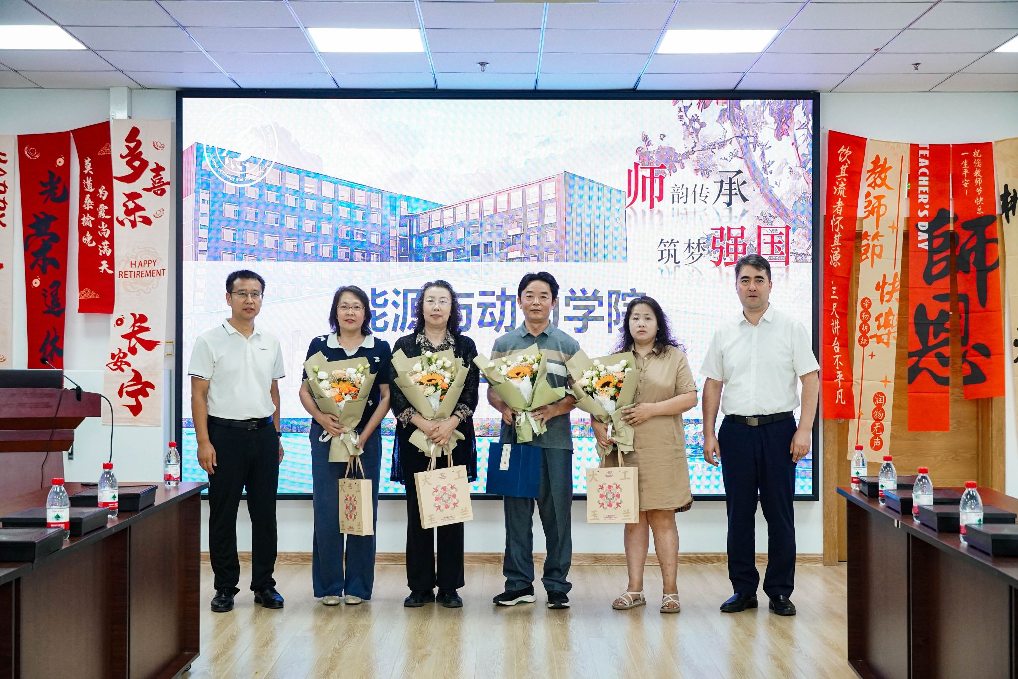 院长杨明军、党委书记东明代表全体师生,向本年度退休的白敏丽、李本文、李颖、刘卫国、王晓放、谢蓉、张岩7位教师致以崇高敬意,向参加仪式的教师代表献上鲜花与纪念品,感谢他们数十年如一日的坚守与付出。大屏幕播放的纪念短片中,退休教师们从青丝到白发的身影,与实验室、课堂、学生合影等画面交织,勾勒出他们为沙巴体育