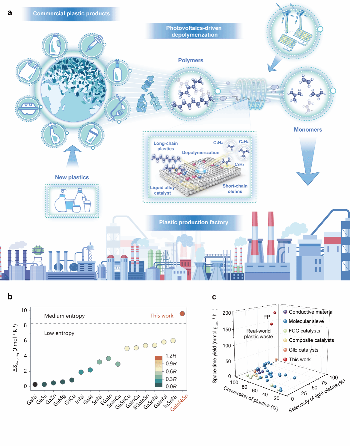 塑料制品的广泛应用为现代社会带来了巨大便利,但其难以自然降解的特性也造成了日益严峻的全球性环境危机。目前全球废弃塑料回收率不足10%,尤其是占全球塑料产量77%以上的聚烯烃类塑料,因其化学惰性导致传统回收方法面临产物收率低、稳定性差等瓶颈。为此,研究团队提出了一种创新的熵调控策略,通过诱导活性位点的界面富集并优化电子结构,成功开发出一种中熵GaInNiSn液态合金催化剂。该催化剂利用动态镓界面上构建的活性位点,激活聚烯烃惰性主链上的碳氢键,进而在常压、不消耗共反应物的条件下将聚烯烃塑料解聚为轻烯烃,实现了79.7%的轻烯烃选择性和181.5 mmol/g/h的轻烯烃时空收率,较现有技术提升一个数量级。研究团队进一步构建了光伏驱动的户外解聚系统,在超过120小时的连续运行中保持了52.8 L/h的轻烯烃产率,为废弃塑料资源化利用提供了高效、可持续的解决方案。相关成果以“Interfacial configurational entropy tuning strategy enabling liquid alloys for efficient depolymerization of polyolefin waste”(基于液态合金的熵调控策略实现聚烯烃废弃物的高效解聚)为题发表于《Nature Communications》,沙巴体育