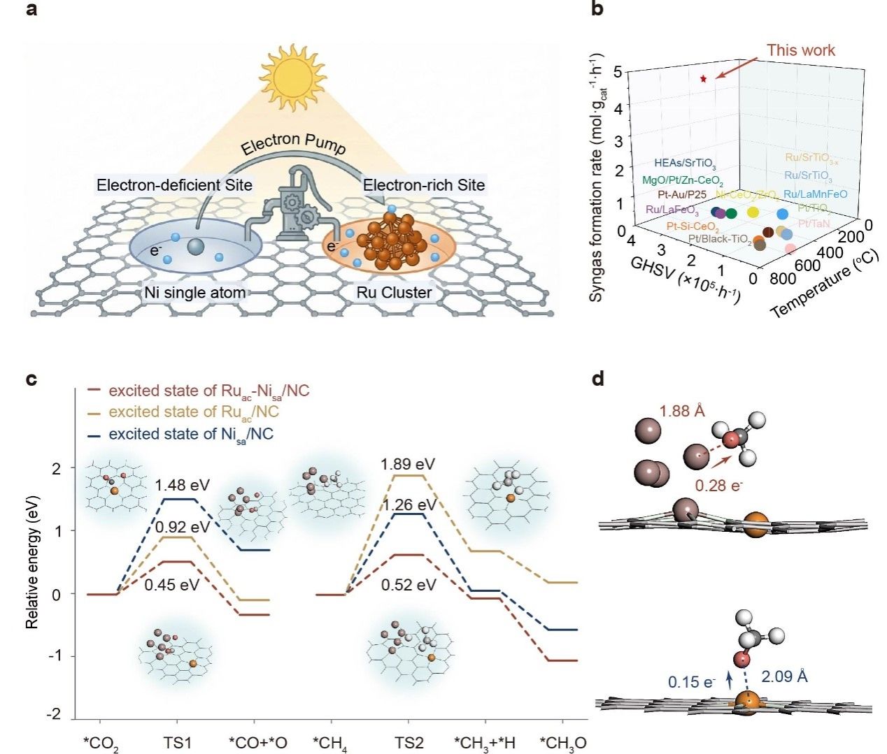 太阳能驱动的甲烷干重整为合成气生产提供了一条节能且环保的途径。然而,该技术目前仍面临产率不足,稳定性差的问题。对此,本团队设计了一种具有不对称光响应结构的电子泵催化剂,该催化剂由钌纳米簇和镍单原子组成,在光照条件下可调控光生电子并克服不利的还原性环境,从而维持电子分布的不对称性。在光照下,电子泵催化剂在500 °C和288,000的空速条件下实现了4.70 mol/g/h的合成气生成速率,较现有技术提升了约5倍,并在1500分钟内保持了优异的稳定性。实验与计算研究表明,这种不对称结构作为电子泵,能够实现定向电子转移并抑制电子-空穴复合,从而形成富电子的钌位点和缺电子的镍位点。这种界面电子配置为反应物的活化及关键中间体甲氧基的形成提供了有利的位点,从而改善了反应动力学。该工作为太阳能驱动反应的催化剂设计开辟了一条新路径,并为提高电子转移效率和促进反应物活化提供了机理依据。相关成果以“Engineering an Electron Pump by Asymmetric Light-responsive Catalyst for Solar-driven Syngas Production”(利用非对称光响应催化剂构筑电子泵以实现太阳能驱动合成气生产)为题发表于《Advanced Materials》,沙巴体育